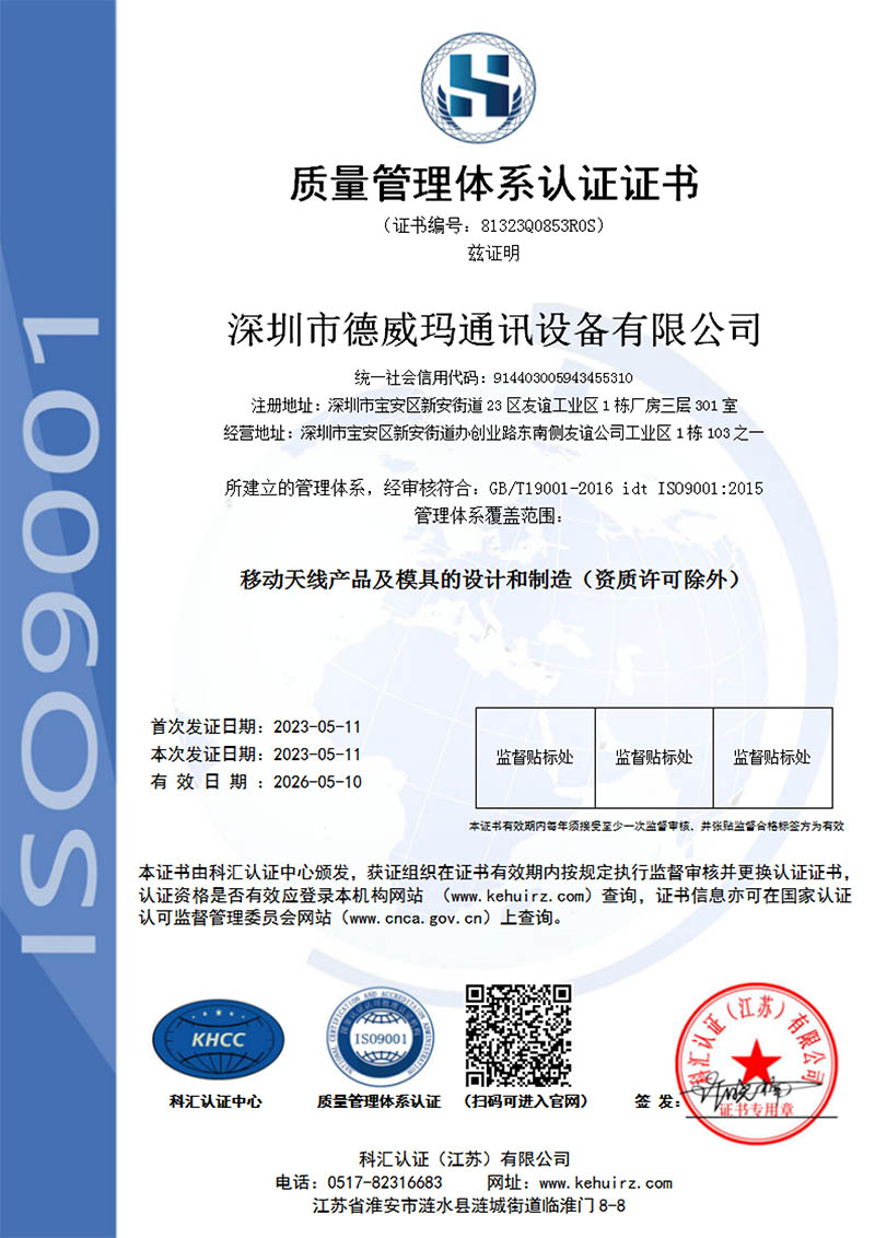 深圳市德威瑪通訊設備有限公司,成立于2011年,是一家集研發(fā)、制造、銷售為一體的中外合資企業(yè).現有員工200多人。公司擁有雄厚的技術人員,先進的進口檢測設備,在吸收國內外優(yōu)秀經驗的同時不斷開發(fā)新產品。企業(yè)總部立足于科技創(chuàng)新城市--深圳,攜手北京和上海的天線研發(fā)中心,面向國內外客戶,公司產品涉及軍工、民用的各類無線電子產品,是率先從事移動天線定制服務的少數企業(yè)之一,企業(yè)提供自主研發(fā)的DWM品牌天線產品及相關的技術解決方案。公司引入ETS三維暗室測試系統2套(含5G暗室),并引進ETS之TRP、TIS測試軟件,可進行BT,WIFI,GPS和北斗,GSM、TD、WCDMA,LTE模式下的各項有源和無源測試,另有網絡分析儀,綜合測試儀,頻譜分析儀多臺,為項目提供強有力的技術支持。